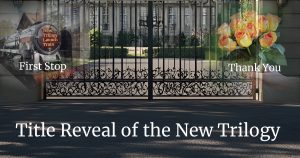 Brown paper and twine wrapped book. The book sits on a vintage desk with ink pens and note books around it, at night in artificial lamp light. Text in white at the top of the image: First Peek at The Cover of the New Trilogy. A Prequel to the Amanda Cadabra Series. Text below book: Can't wait to rip off the paper?